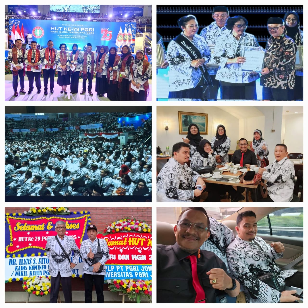 Jakarta – Pengurus PGRI Sumut ikut hadir dalam puncak peringatan HUT ke 79 PGRI dan Hari Guru Nasional 2024 dengan tema guru bermutu Indonesia maju guru hemat Indonesia kuat bertempat di Padepokan Pencak Silat TMII Jakarta Sabtu, 14/12/24.