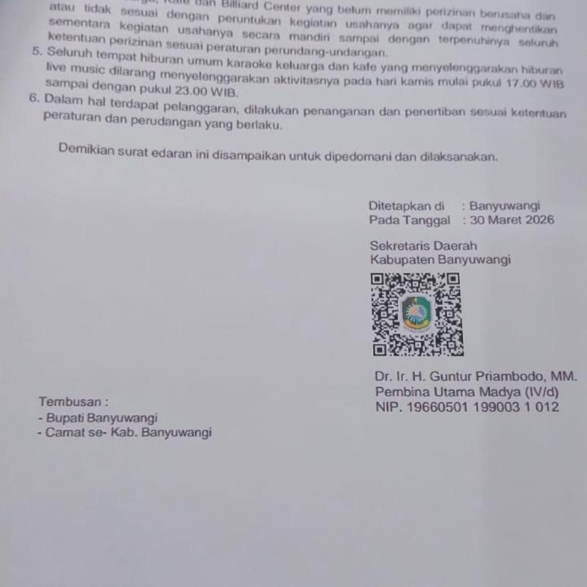 Surat edaran ini ditetapkan di Banyuwangi pada 30 Maret 2026 dan ditandatangani oleh Sekretaris Daerah Kabupaten Banyuwangi, Dr. Ir. H. Guntur Priambodo, MM.