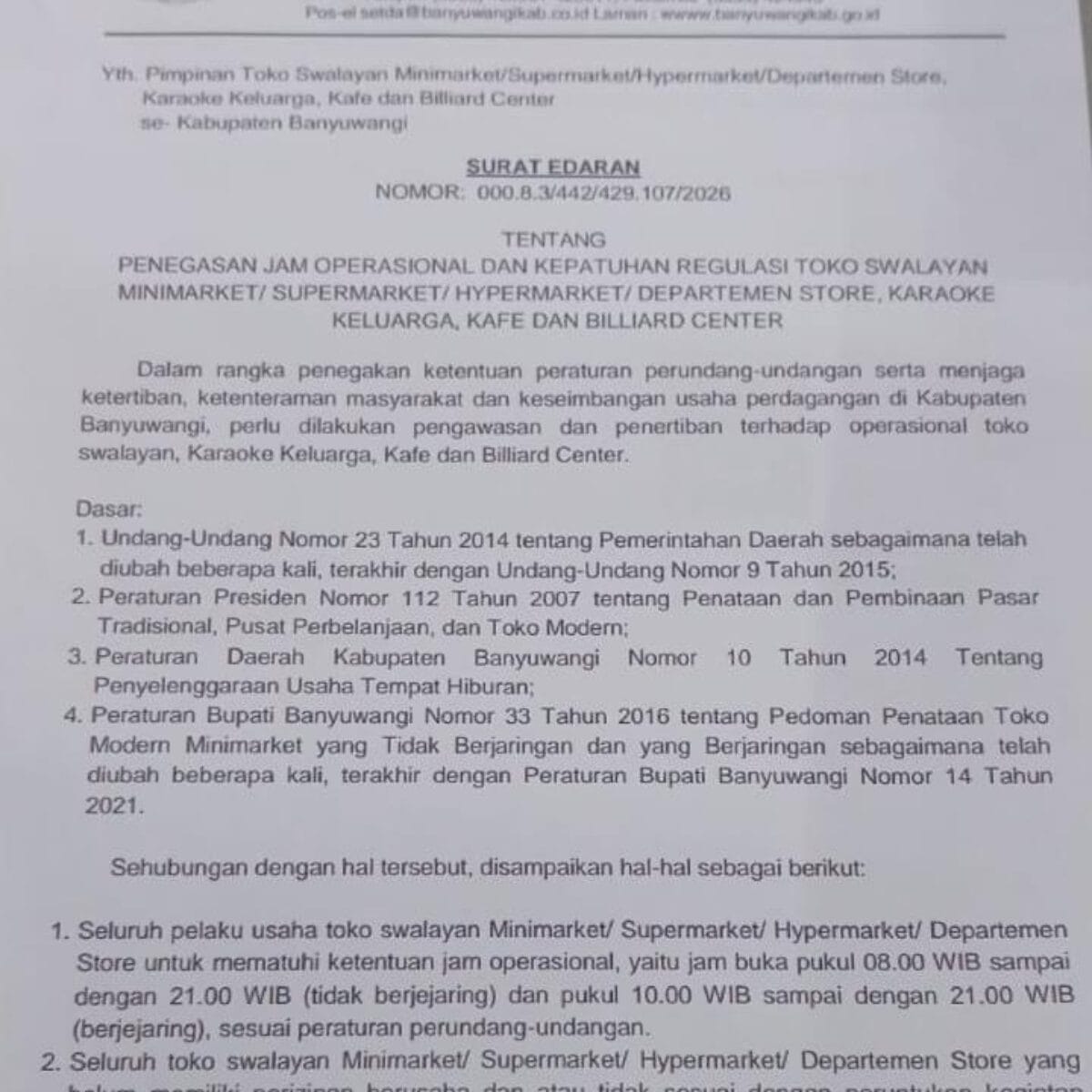 BANYUWANGI, DOMAINRAKYAT.COM – Pemerintah Kabupaten Banyuwangi melalui Sekretariat Daerah resmi mengeluarkan surat edaran terkait penegasan jam operasional serta kepatuhan terhadap regulasi bagi pelaku usaha toko swalayan, minimarket, supermarket, hypermarket, departemen store, karaoke keluarga, kafe, dan billiard center, Kamis (02/04/2026).
