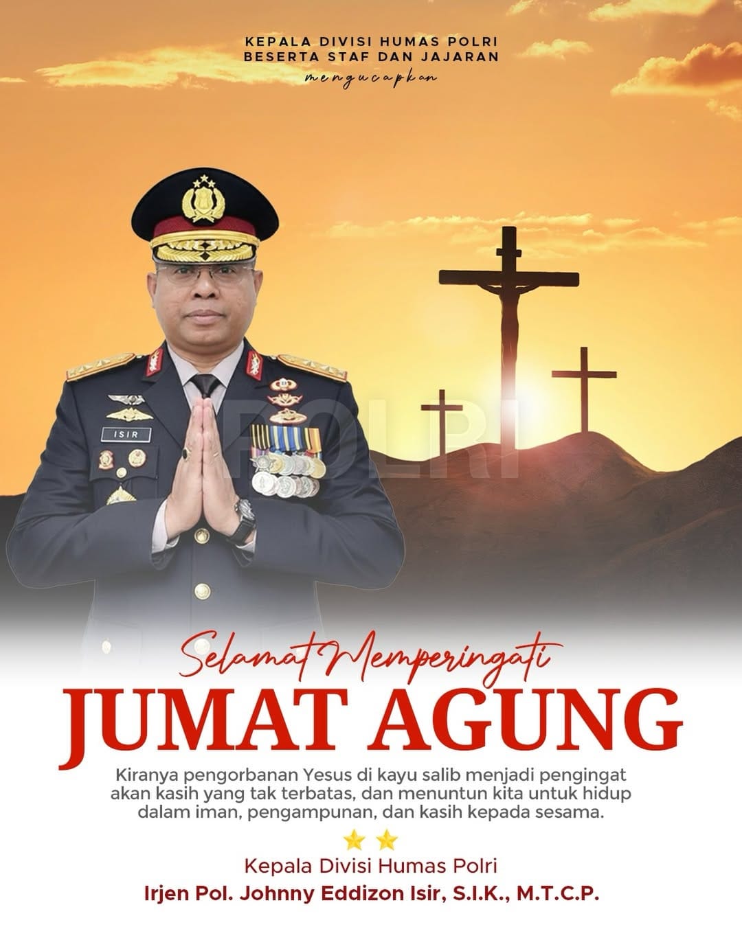 JAKARTA, DOMAINRAKYAT.COM  – Suasana khidmat menyelimuti peringatan Jumat Agung tahun ini. Di tengah refleksi mendalam umat Kristiani atas pengorbanan dan kasih, Kepala Divisi Humas Polri, Irjen Pol. Johnny Eddizon Isir, S.I.K., M.T.C.P., turut menyampaikan ucapan penuh makna yang menyentuh nilai kemanusiaan dan spiritualitas.