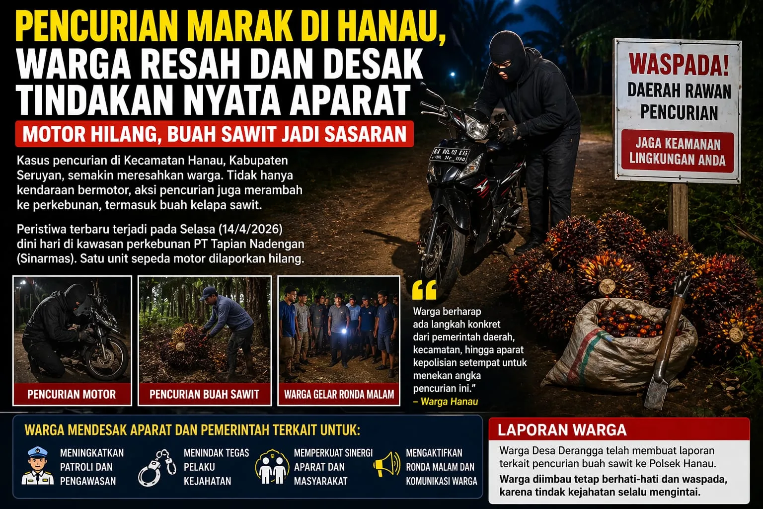 Tak hanya kendaraan, pencurian buah sawit milik warga Desa Derangga—yang berbatasan langsung dengan area perkebunan perusahaan—juga dilaporkan semakin sering terjadi. Warga menduga pelaku merupakan kelompok yang sama dan telah berulang kali beraksi tanpa tertangkap.