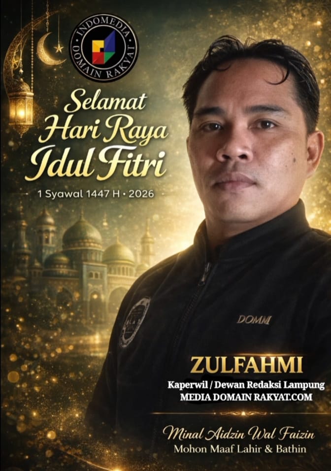 LAMPUNG, DOMAINRAKYAT.COM – Dalam suasana penuh kebahagiaan dan kemenangan di Hari Raya Idul Fitri 1447 Hijriah / 2026 Masehi, keluarga besar Media Domain Rakyat.com menyampaikan ucapan selamat kepada seluruh masyarakat Minal aidzin Wal Faidzin Mohon maaf lahir batin.Jum’at 19/03/2026