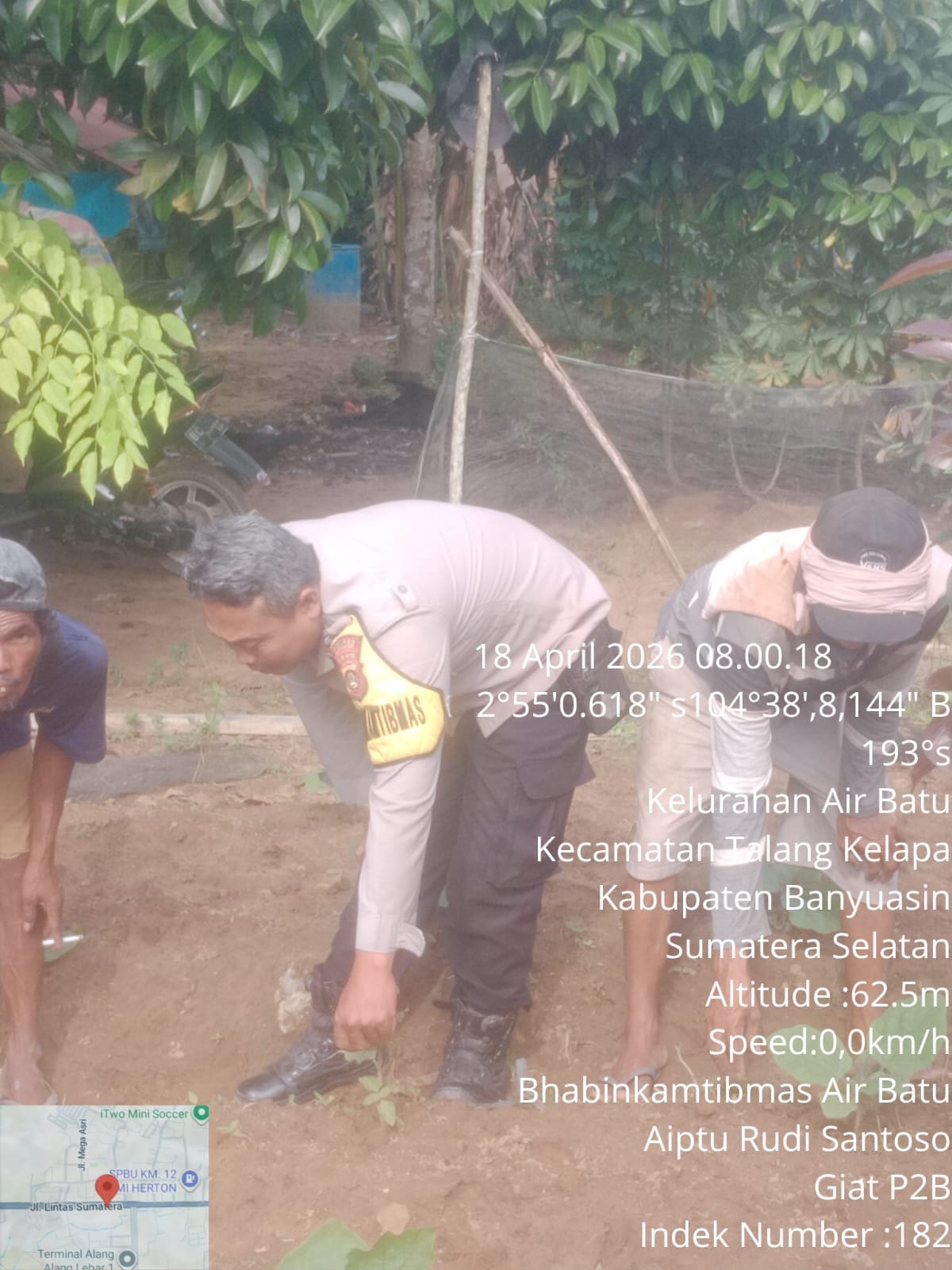 Banyuasin,Domainrakyat.com – Dalam upaya mendukung program strategis Pemerintah Pusat di bidang ketahanan pangan, AIPTU Rudi Santoso, Bhabinkamtibmas Polsek Talang Kelapa, menggelar kegiatan himbauan dan penggerakan masyarakat di Kelurahan Air Batu, Kecamatan Talang Kelapa, Kabupaten Banyuasin, pada Sabtu (18/4/2026) siang.