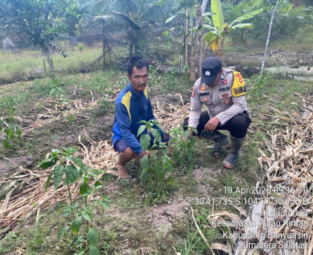 BanyuasinDomainrakyat.com – Dalam rangka mendukung program prioritas Presiden Republik Indonesia di bidang swasembada pangan nasional, Bhabinkamtibmas Polsek Pulau Rimau, Polres Banyuasin, menggelar kegiatan imbauan dan penggerakan masyarakat melalui Program P2B (Pangan, Ketahanan, dan Kemandirian Pangan). Kegiatan berlangsung di Desa Kelapa Dua, Kecamatan Selat Penuguan, Kabupaten Banyuasin, pada Minggu (19/4/2026).