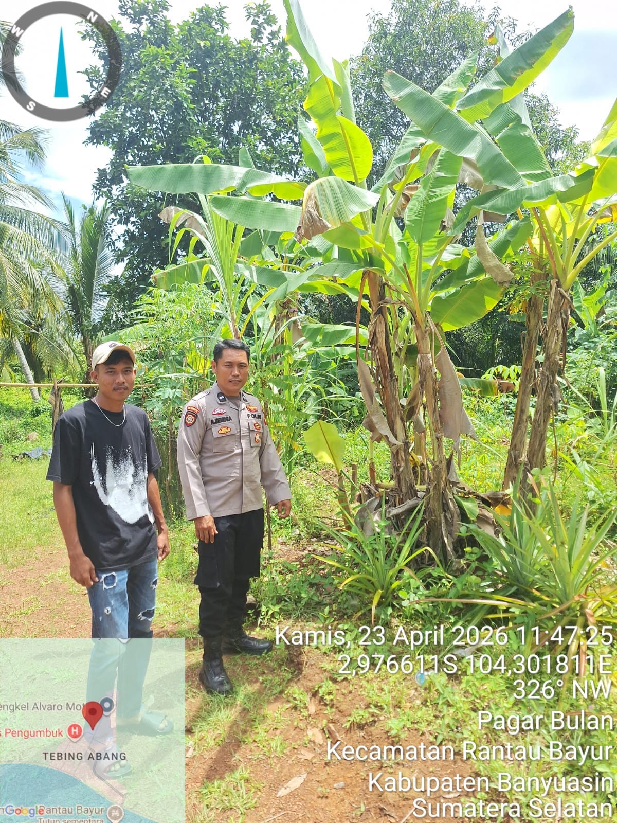 Banyuasin,Domainrakyat.com – Dalam rangka mendukung program prioritas Presiden RI di bidang swasembada pangan nasional, Bhabinkamtibmas Polsek Rantau Bayur menggelar kegiatan himbauan dan penggerakan masyarakat di Desa Tebing Abang, Kecamatan Rantau Bayur, Kabupaten Banyuasin, Kamis (23/4/2026) siang.