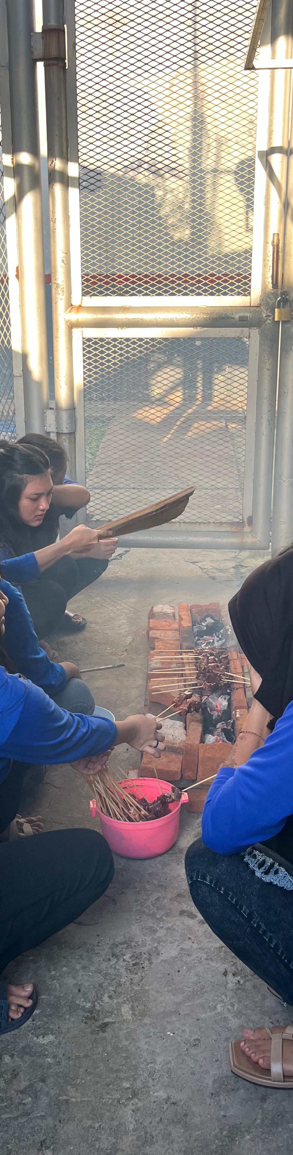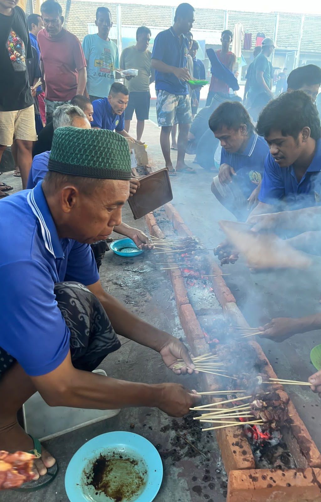Menggunakan perlengkapan sederhana, Warga Binaan terlihat kompak dalam meyiapkan segala bahan yang dibutuhkan untuk membakar sate yang telah disebar menyeluruh ke setiap kamar hunian.