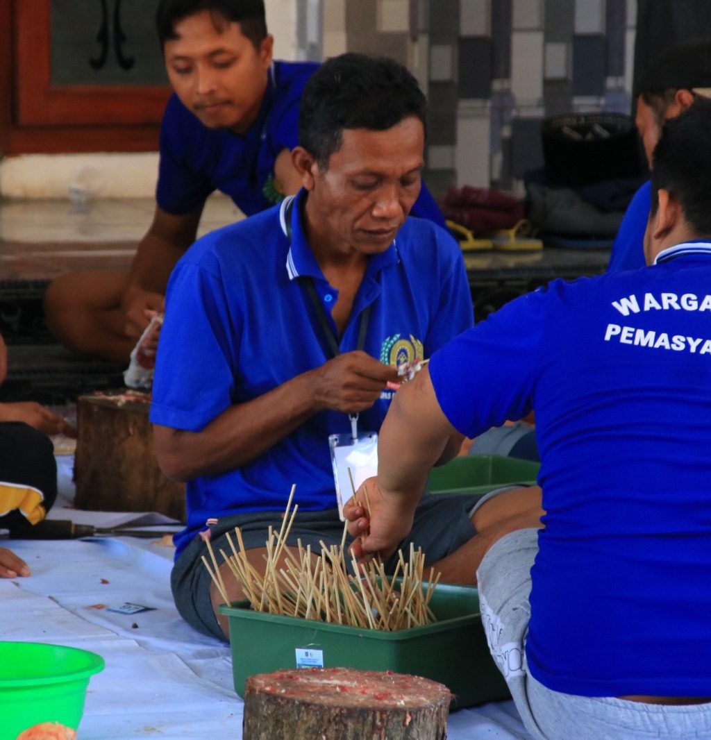 Perolehan daging qurban hasil pemotongan hewan qurban di Lembaga Pemasyarakatan (Lapas) Kelas IIA Banyuwangi dimanfaatkan oleh Warga Binaan dengan membuat sate. Mereka pun kompak nyate bareng di depan kamar hunian masing-masing, Jumat (6/6).