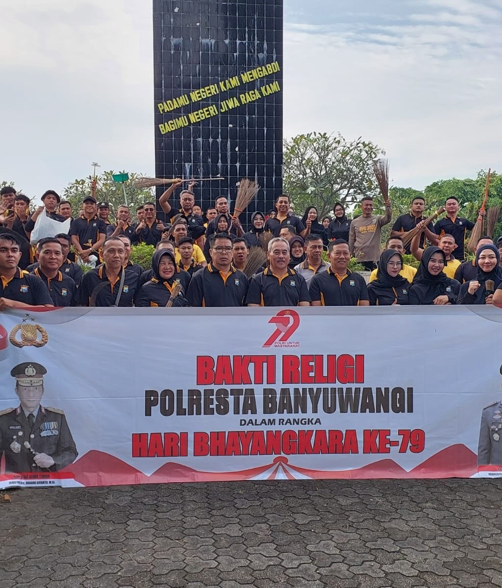 Bakti religi berupa kegiatan kebersihan lingkungan ini menjadi bagian dari rangkaian peringatan Hari Bhayangkara ke-79 yang diselenggarakan Polresta Banyuwangi.