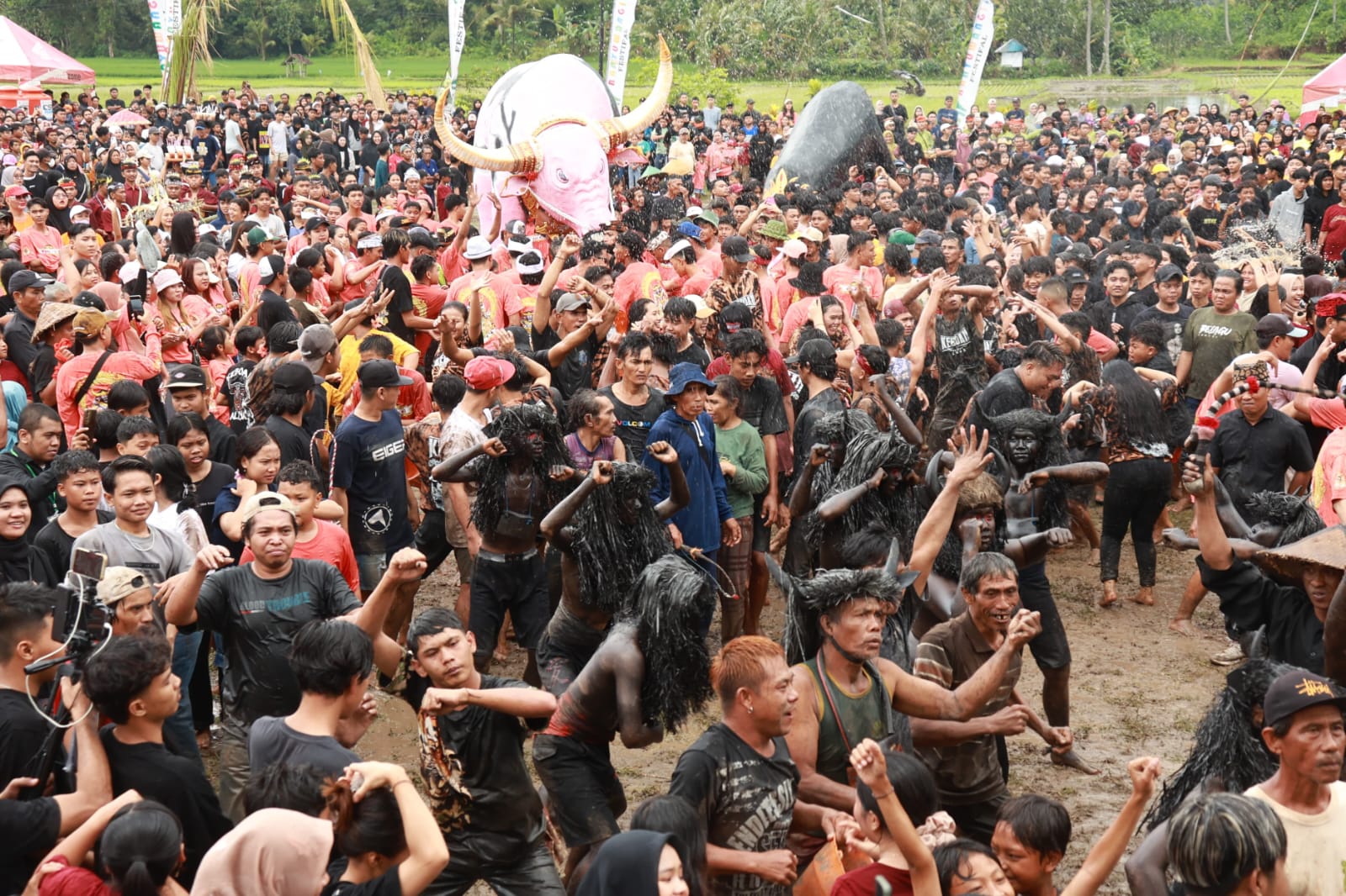 Ribuan orang memadati Desa Aliyan, Kecamatan Rogojampi, Banyuwangi, untuk menyaksikan ritual adat Keboan Aliyan, Minggu (29/6/2025). Tradisi sakral yang digelar setiap bulan Suro ini sudah menjadi menjadi magnet wisatawan setiap tahunnya.