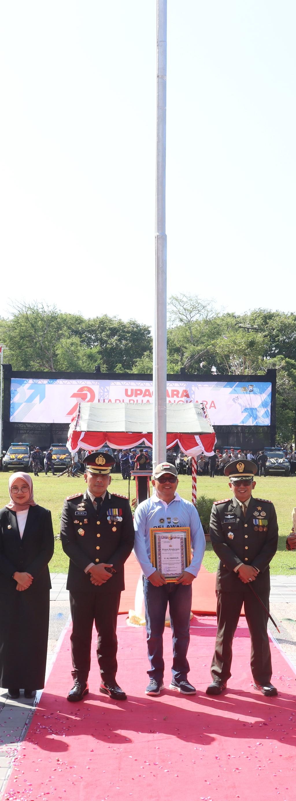 Bertindak sebagai inspektur upacara, Kapolresta Banyuwangi Kombes Pol Rama Samtama Putra, S.I.K., M.Si., M.H., memimpin langsung jalannya prosesi. Kegiatan ini dihadiri oleh jajaran Forkopimda, TNI-Polri, tokoh agama, tokoh masyarakat, pelajar, dan berbagai elemen warga yang menjadi mitra strategis Polri.