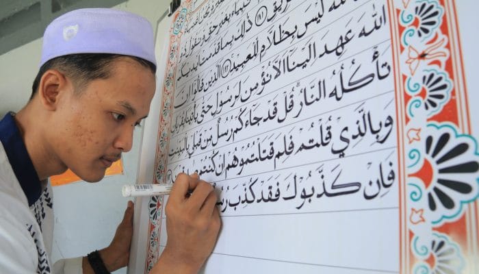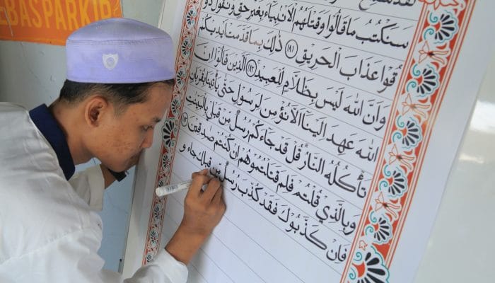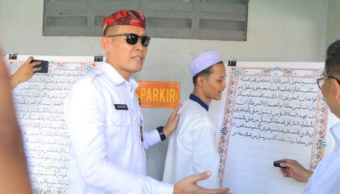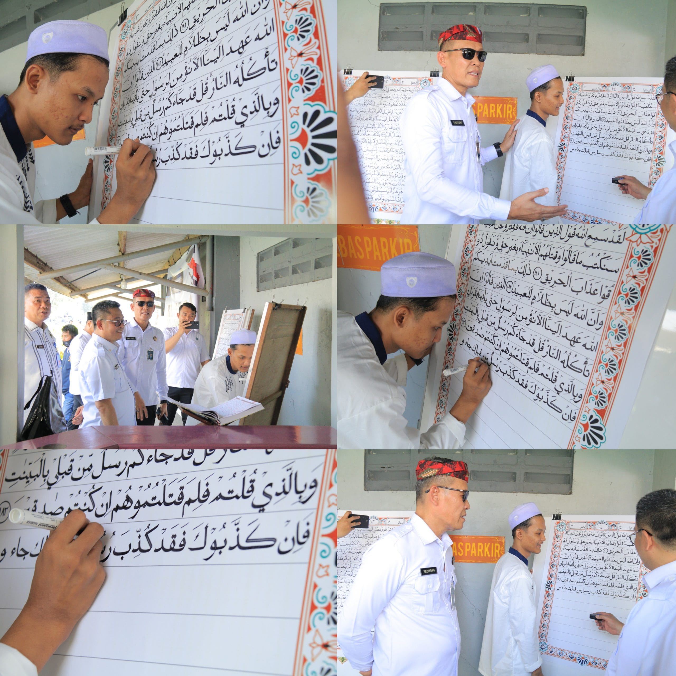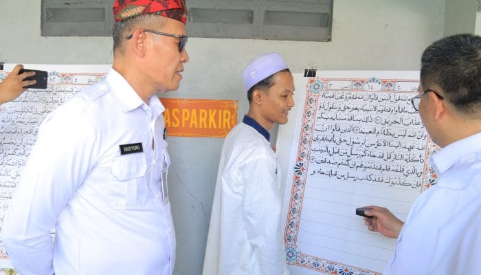 Peragaan penulisan Al-Quran berukuran besar yang dikerjakan oleh warga binaan Lembaga Pemasyarakatan (Lapas) Kelas IIA Banyuwangi mewarnai deklarasi komitmen bersama untuk mewujudkan Lapas dan Rutan Bersih dari narkoba dan telepon genggam ilegal yang digelar oleh Kantor Wilayah Direktorat Jenderal Pemasyarakatan (Ditjen PAS) Jawa Timur, Rabu (21/5/25).