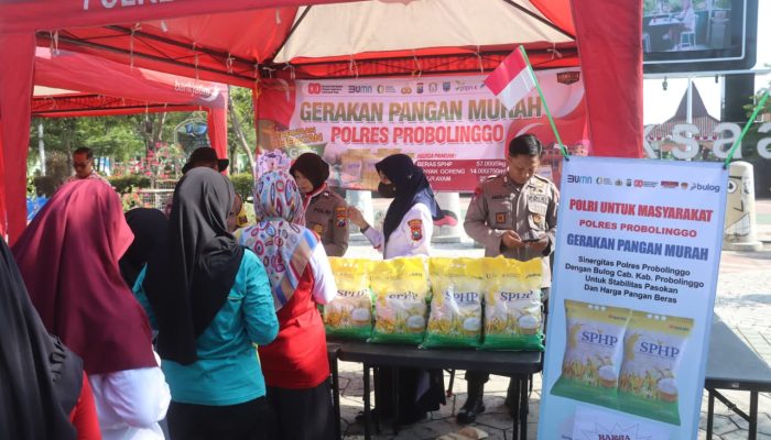 Polres Probolinggo Polda Jawa Timur (Jatim) bersama Polsek jajaran menggelar Gerakan Pangan Murah di Kabupaten Probolinggo,