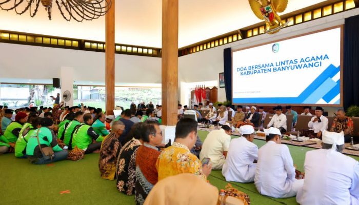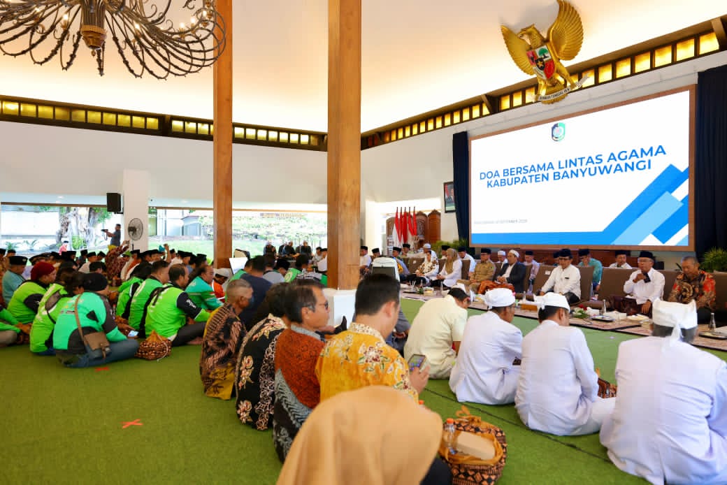 Berbagai elemen masyarakat menggelar doa bersama di Pendopo Shaba Swagata Blambangan Kabupaten Banyuwangi, Senin (1/9/2025). Mereka memanjatkan harapan kepada Tuhan Yang Maha Esa untuk menjaga kedamaian kabupaten di ujung timur Pulau Jawa tersebut.