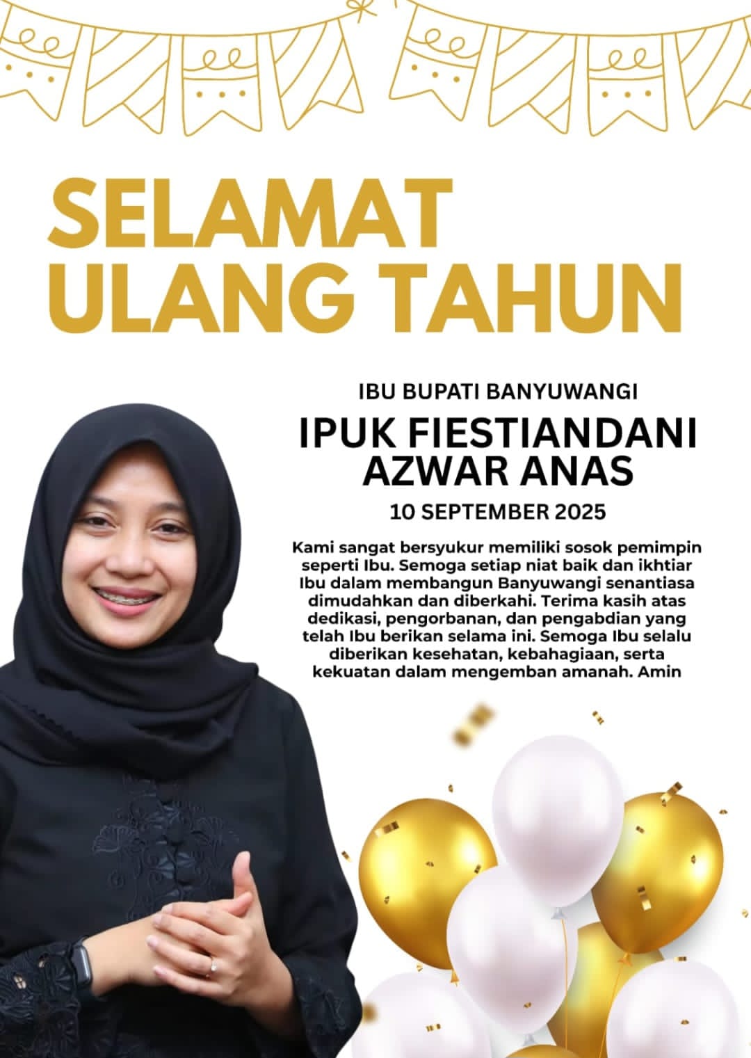 Ucapan ini juga menjadi bentuk apresiasi atas dedikasi Bupati Banyuwangi yang terus berkomitmen membangun daerah, baik melalui program pemberdayaan masyarakat, peningkatan pelayanan publik, maupun pengembangan potensi lokal.