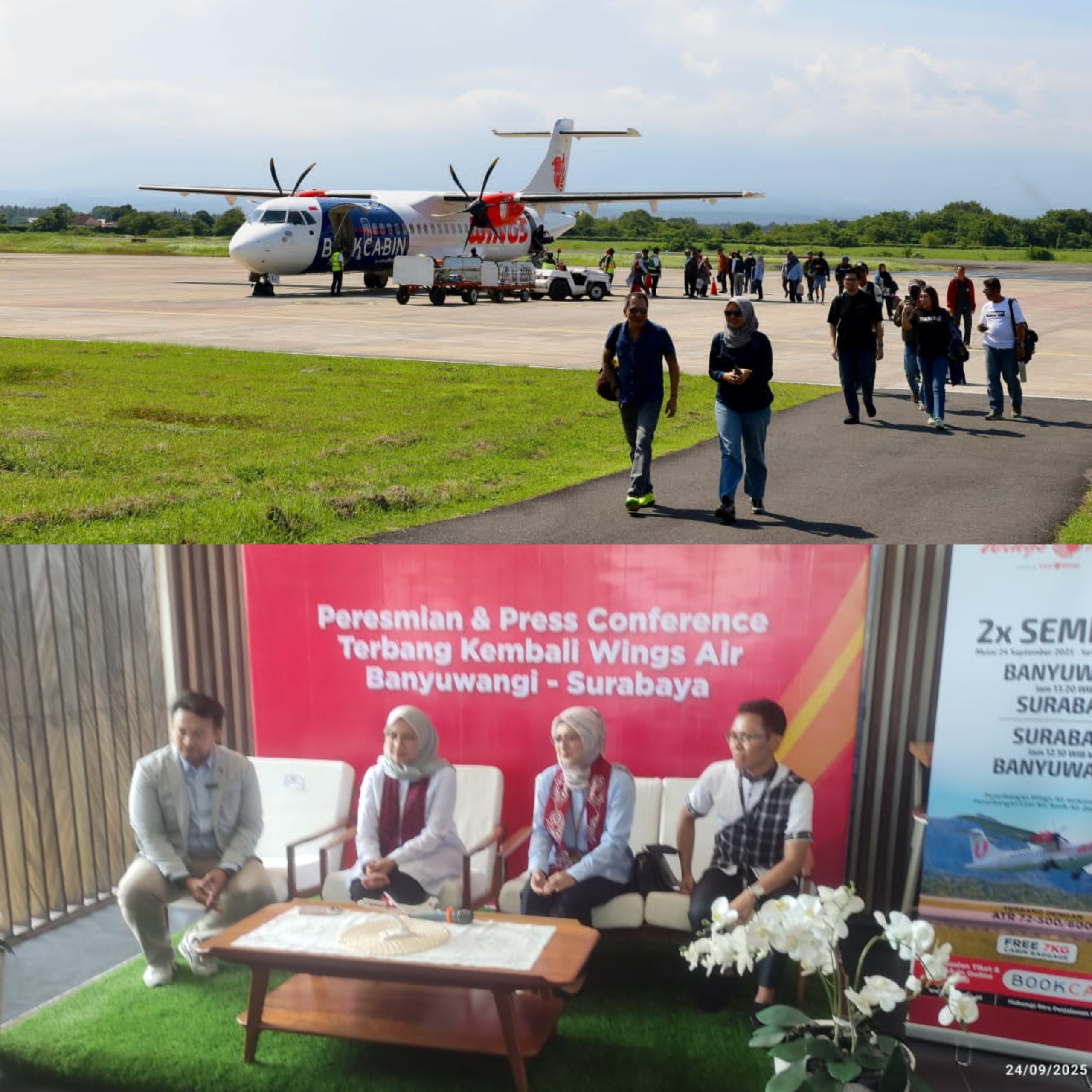 Setelah sempat terhenti karena pandemi Covid-19, penerbangan rute Surabaya-Banyuwangi PP akhirnya aktif kembali. Penerbangan yang dilayani oleh maskapai Wings Air itu beroperasi perdana, Rabu (24/9/2025). Selain itu, Lion Group juga menjajaki penerbangan dari Banyuwangi menuju Lombok dan Kuala Lumpur Malaysia.