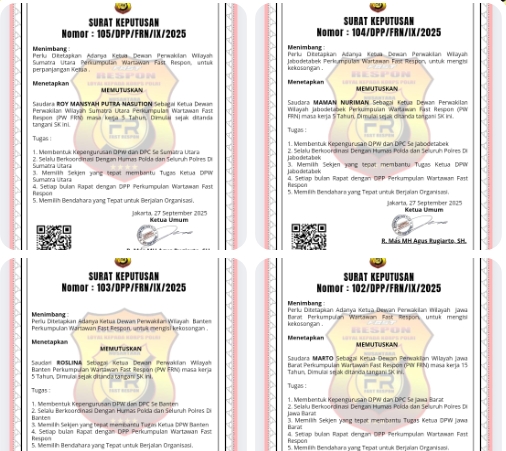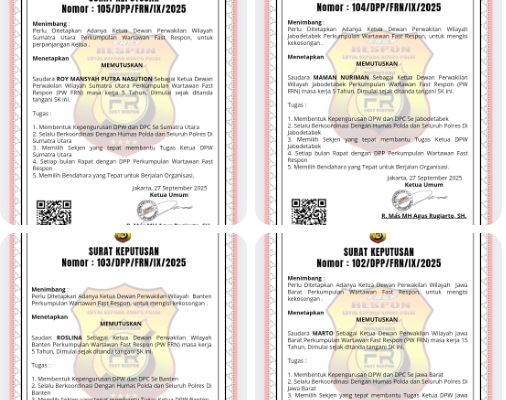 Dalam upaya memperkuat struktur organisasi di seluruh wilayah Indonesia, Ketua Umum Perkumpulan Wartawan (PW) Fast Respon Nusantara (FRN) Counter Polri, Agus Flores, resmi mengeluarkan Surat Keputusan (SK) terbaru terkait pengangkatan Ketua Dewan Pimpinan Wilayah (DPW) FRN,