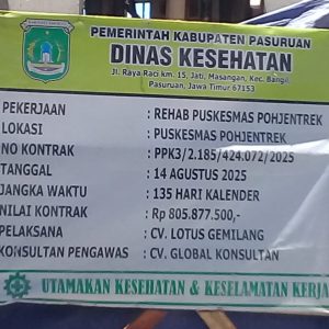 Proyek rehabilitasi Puskesmas Pohjentrek di Kabupaten Pasuruan diduga menyimpan sejumlah penyimpangan. Proyek senilai Rp 805.877.500 ini dikerjakan oleh CV Lotus Gemilang dengan CV Global Konsultan sebagai pengawas. Pekerjaan dimulai pada 14 Agustus 2025 dan ditargetkan selesai dalam 135 hari kalender.