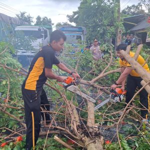 Begitu menerima laporan masyarakat, personel Polresta Banyuwangi langsung diterjunkan ke lokasi untuk melakukan pengamanan area, mengalihkan arus kendaraan, serta membantu proses evakuasi material pohon tumbang.