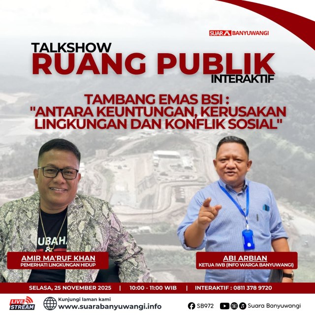 Talkshow “Ruang Publik” yang disiarkan oleh Suara Banyuwangi pada tanggal 25 November 2025 mendatang, siap menggemparkan publik dengan mengangkat isu krusial seputar tambang emas BSI. Acara yang bertajuk “Antara Keuntungan, Kerusakan Lingkungan dan Konflik Sosial” ini menjanjikan perdebatan panas antara para ahli dan tokoh masyarakat.