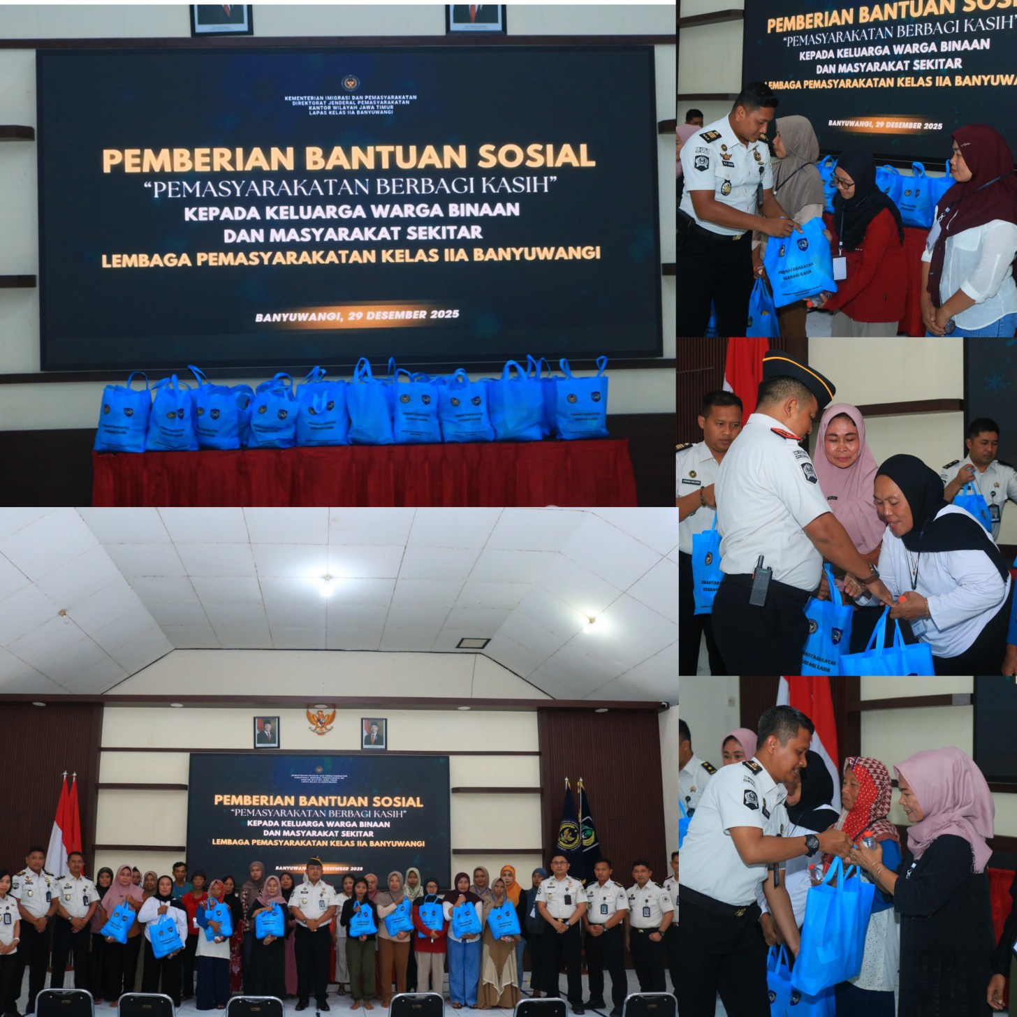 Kepala Lapas Banyuwangi, I Wayan Nurasta Wibawa, memimpin langsung jalannya pembagian paket sembako dengan didampingi oleh jajaran pejabat struktural. Sebanyak 28 paket sembako diserahkan kepada keluarga warga binaan, sedangkan 12 paket sembako dibagikan pada masyarakat sekitar.