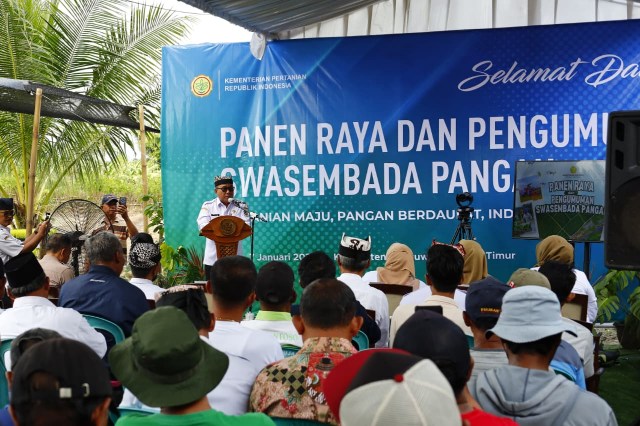 Pencapaian swasembada pangan nasional diumumkan Presiden Prabowo saat Panen Raya di Karawang, Jawa Barat, yang diikuti secara virtual oleh pemerintah provinsi serta kabupaten/kota se-Indonesia, termasuk di Kabupaten Banyuwangi, yang digelar di kawasan Usaha Jasa Pelayanan Alsintan (UPJA) Sri Rejeki, Desa/Kecamatan Cluring, Banyuwangi.