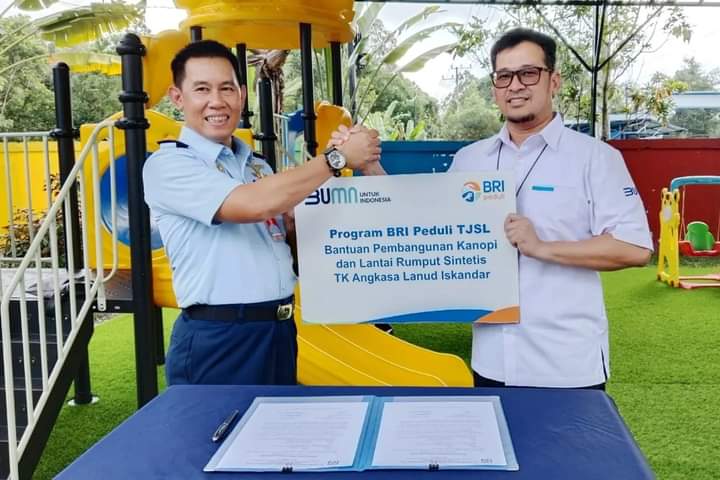 ‘Terima Kasih kepada BRI, yang merupakan mitra dari Lanud Iskandar atas bantuan CSR untuk yayasan berupa kanopi dan lantai rumput sintetis playground TK Angkasa, kedepan diharapkan dengan adanya fasilitas ini dapat meningkatkan kualitas dalam mendidik anak-anak.” ucap Danlanud