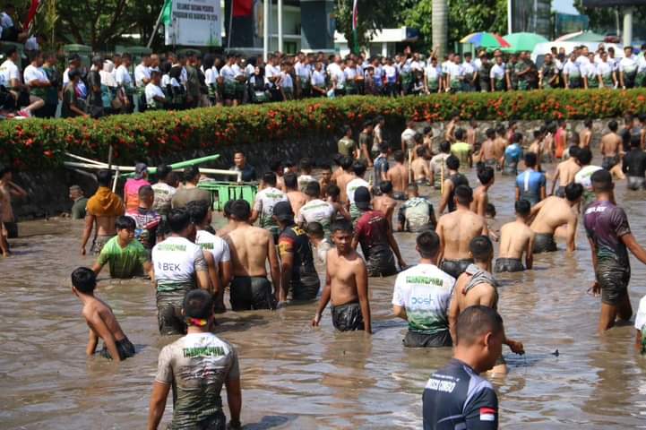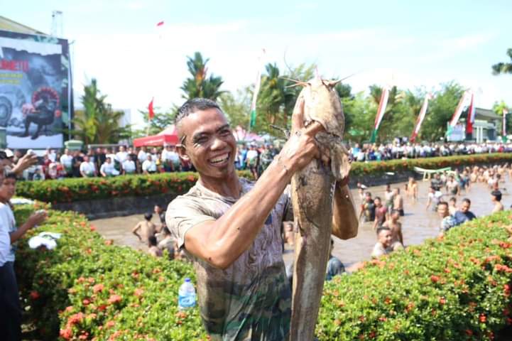 Walaupun badan basah dan penuh dengan lumpur mereka tidak surut untuk mendapatkan ikan Patin dan Lele yang sebelumnya dilepaskan oleh Pangdam XII/Tpr.