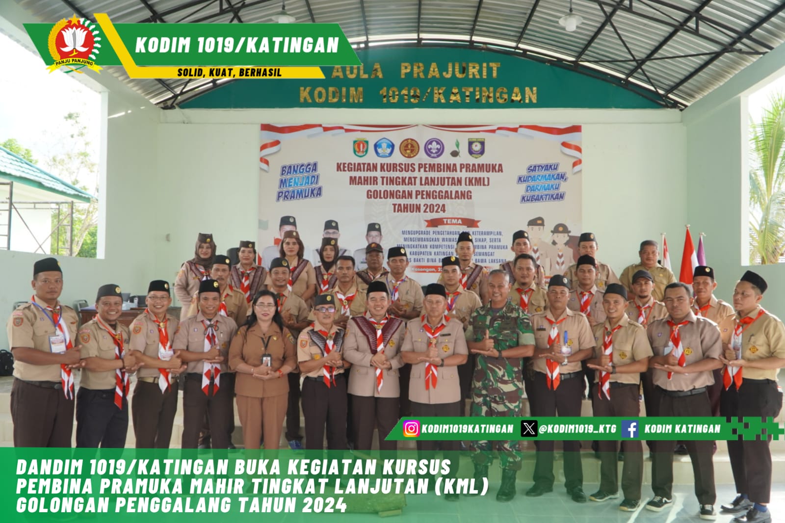Kasongan. DOMAINRAKYAT.com- Dandim 1019/Ktg yang di Wakili Kasdim 1019/Ktg Mayor Inf Slamet Dyanur Pimpin Upacara Pembukaan Kegiatan Kursus Pembina Pramuka Mahir Tingkat Lanjutan (KML) Golongan Penggalang Tahun 2024. Bertempat di Aula Prajurit Kodim 1019/Ktg Jalan. Ahmad Yani, Komplek Perkantoran Kereng Humbang, Kel. Kasongan Lama, Kec. Katingan Hilir, Kab. Katingan. Selasa (23/07/2024).