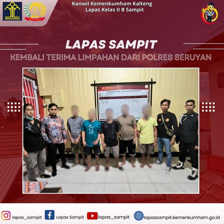 SAMPIT. DOMAINRAKYAT.com// Lembaga Pemasyarakatan Lapas Kelas IIB Sampit kembali menerima 5 (Lima) orang tahanan dari Polres Seruyan, Jum’at (08/08/2024). Pelimpahan para tahanan tersebut ke Lapas Sampit diantar oleh anggota Kepolisian Resor (Polres) Seruyan dan tiba pada Pukul 17.20 WIB.