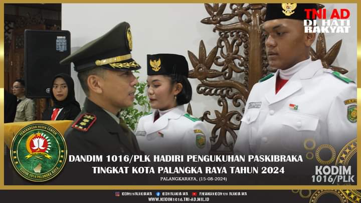 Palangka Raya. DOMAINRAKYAT.com// Komandan Kodim (Dandim) 1016/Palangka Raya Letkol Arh Jimmy Hutapea, S.E menghadiri Upacara Pengukuhan Pasukan Pengibar Bendera Pusaka (Paskibraka) Tingkat Kota Palangka Raya Tahun 2024 yang diselenggarakan di Aula Rumah Jabatan Walikota Palangka Raya Jalan Diponegoro Kelurahan Pahandut Kecamatan Pahandut Kota Palangka Raya Kamis malam, (15/8/2024).