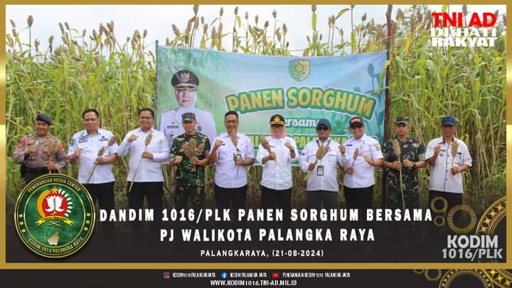 Palangka Raya. DOMAINRAKYAT.com// Komandan Kodim 1016/Plk Letkol Arh Jimmy Hutapea, S.E.,bersama dengan Pj Walikota Palangka Raya Dr Hera Nugrahayu, M.Si bersama instansi terkait melaksanakan panen tanaman Sorghum bertempat di Taman Tekhnologi Pertanian (TPP) jalan Perkebunan km.33 Kelurahan Banturung Kecamatan Bukit Batu , Kota Palangka Raya Rabu, (21/08/2024).