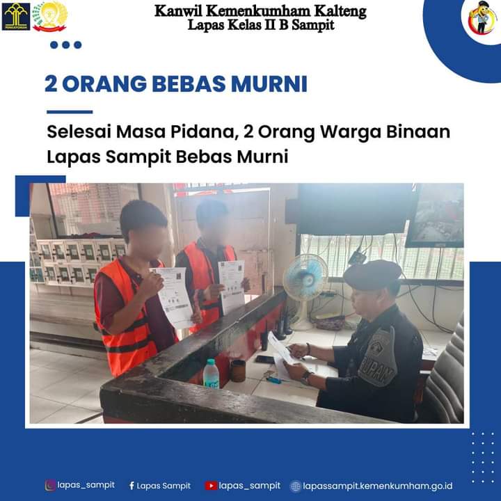 Sampit-DOMAINRAKYAT.com// Setelah menjalani masa pidana dan pembinaan di Lapas Kelas IIB Sampit, 2(dua) orang Warga Binaan Pemasyarakatan (WBP) Lembaga Pemasyarakatan (Lapas) Kelas IIB Sampi tatas nama Rahmad Sahidin Bin Pandowi dan Widiyanto Bin Bejo Utomo(Alm) kembali ke masyarakat dengan status Bebas Murni, Rabu (28/08/2024).