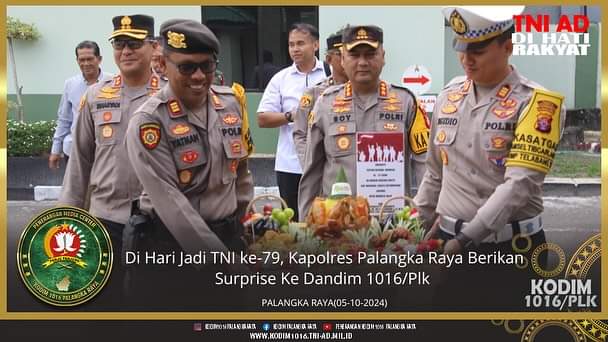 Palangka Raya—DOMAINRAKYAT.com// Di hari jadinya Tentara Nasional Indonesia (TNI) yang ke – 79 tahun 2024, di pimpin Kapolres Palangka Raya Kombes Pol. Boy Herlambang, S.I.K., M.Si., dan rombongan, memberikan Surprise ucapan selamat HUT TNI yang ke-79 dengan memberikan Tumpeng kepada Dandim 1016/Plk bertempat di Makodim 1016/Plk Jl.Ahmad Yani No. 80,Kecamatan Pahandut,Kota Palangka Raya, Sabtu (5/10/2024).