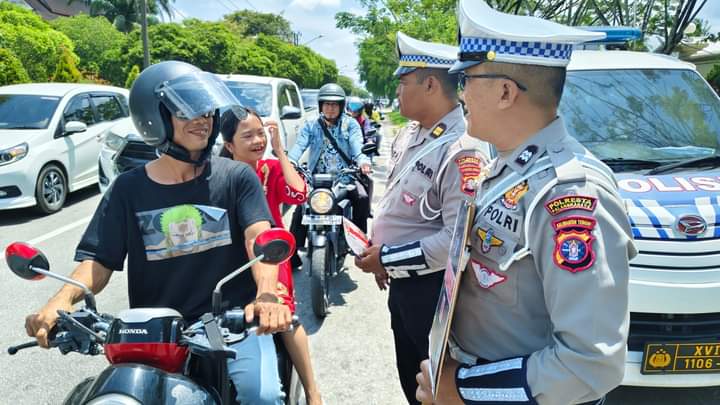 Selain itu, petugas juga membagikan selebaran informasi mengenai peraturan lalu lintas dan cara aman berkendara.