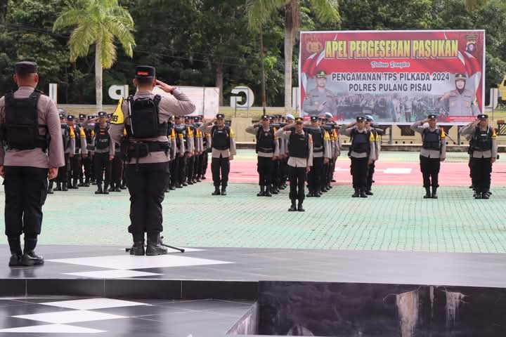 Pulang Pisau –DOMAINRAKYAT.com// Polres Pulang Pisau, Polda Kalteng melaksanakan apel Pergeseran Pasukan (Serpas) pengamanan pemungutan suara pilkada di wilayah Kabupaten Pulang Pisau, bertempat di Lapangan Apel Polres Pulang Pisau, Minggu (24/11/2024) Pagi.