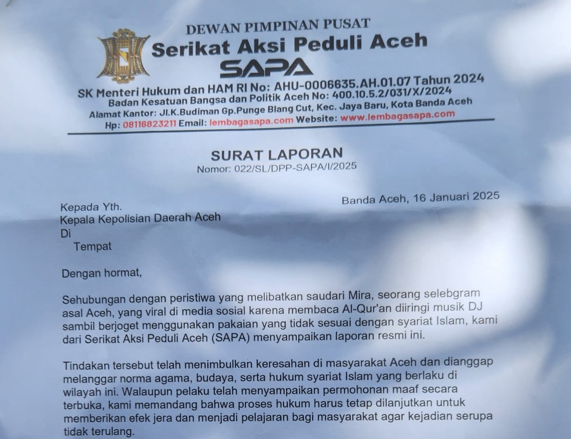 Banda Aceh– DOMAINRAKYAT.com// Serikat Aksi Peduli Aceh (SAPA) melayangkan surat resmi kepada Polda Aceh untuk mengusut tuntas kasus yang melibatkan selebgram asal Aceh, Mira, yang viral di media sosial karena membaca Al-Qur’an diiringi musik DJ sambil berjoget dengan pakaian yang tidak sesuai syariat Islam.