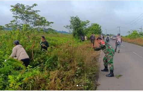 Pangkalan Bun– DOMAINRAKYAT.com// Anggota Koramil 1014 – 03/Kolam Sertu Erli Siswanto bersama warga binaan melaksanakan Gotong Royong di dengan pembersihkan kanan kiri jalan poros Pangkalan Bun – Kotawaringin Lama, (17/01/2025).