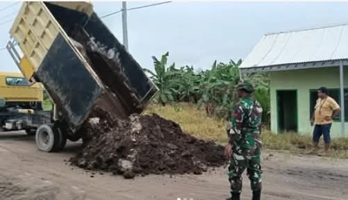 Seperti pada, Selasa (25/2/2025) pagi, pendistribusian material bangunan dilakujan dengan menggunakan mobil dump truk. Material yang sedang diangkut berupa tanah urug, yang akan digunakan sebagai bahan untuk penimbunanan bagian jalan yang berlubang.