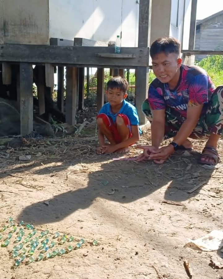 Terlihat salah satu anggota Satgas Pratu Husni selepas bekerja tengah memanfaatkan waktu istirahatnya untuk bermain kelereng bersama anak-anak, keceriaan mereka bermain kelereng membuat satgas TMMD melupakan semua kelelahan selama bekerja satu hati penuh.