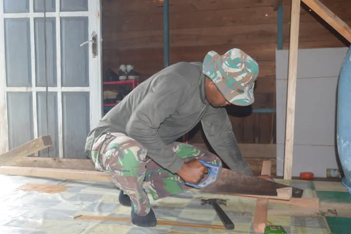 Bersama warga setempat, Satgas TMMD bahu membahu mengejar target pengerjaan rehab rumah ini agar cepat selesai dan bisa dimanfaatkan pemiliknya.