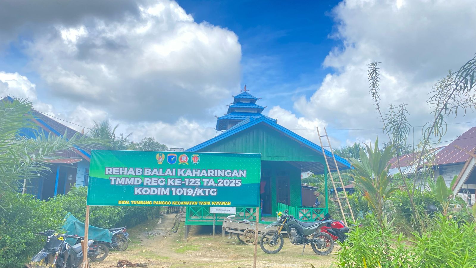Satgas TMMD Reg Ke-123 Kodim 1019/Ktg bersama warga untuk memperbaharui cat balai Kaharingan yang merupakan sasaran tambahan TMMD Reg ke-123 selain itu juga untuk memberikan rasa nyaman dan lebih khusuk bagi umat hindu kaharingan dalam melaksanakan ibadah.