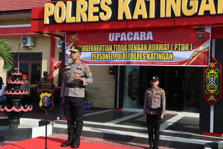 Katingan– DOMAINRAKYAT.com// Polres Katingan, jajaran Polda Kalteng menggelar upacara Pemberhentian Tidak Dengan Hormat (PTDH) kepada dua anggotanya yang melanggar Kode Etik Polri, Rabu (23/04/2025) pagi.