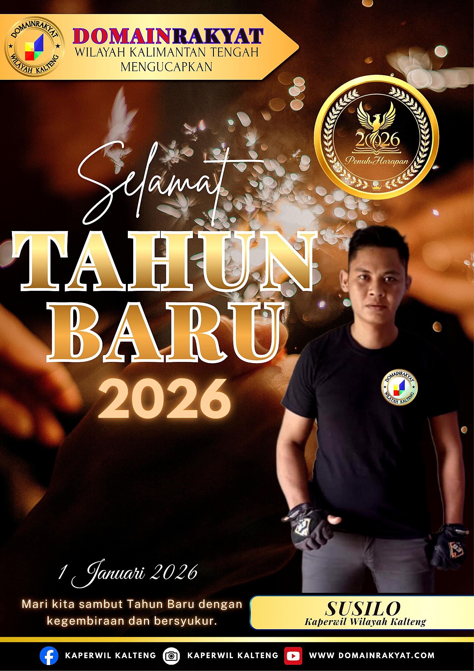 Kalteng– DOMAINRAKYAT.com// Kepala Perwakilan Wilayah (Kaperwil), mewakili seluruh rekan-rekan media DomainRakyat Wilayah Kalimantan Tengah, mengucapkan Selamat Tahun Baru 2026.