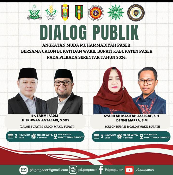 DOMAINRAKYAT.com//PASER-T.GROGOT Angkatan Muda Muhammadiyah Kabupaten Paser bertempat di Kampus UMKT Kab. Paser, pada Sabtu, 02 November 2024 mengadakan event Dialog Publik Bersama Calon Bupati dan Wakil Bupati Paser. Event luar biasa ini adalah rangkaian acara dari Sektor Kepemudaan yang sangat menginginkan di Perhelatan Pilkada Kab. Paser kali ini benar benar melahirkan Pemimpin Daerah yang benar benar menginterpresentasikan keinginan rakyat. Event ini benar benar menjadi ruang dan wadah bagi Pemuda Muhammadiyah membedah dengan maksimal tujuan para Calon Bupati dan Wakil Bupati Pilkada Paser untuk maju berkontestasi, fakta menarik dari kegiatan ini, yaitu dilakukan pada 2 sesi yang berbeda. Dimana Paslon 01 mengisi sesi pertama pada pukul 08.30 s/d selesai dan hanya dihadiri oleh Calon Wakil Bupatinya yaitu Bapak Ikhwan Antasari S.Sos. Kemudian di sesi kedua dilaksanakan pada pukul 13.30 s/d selesai yang langsung dihadiri Calon Bupatinya yaitu Ibu Hj Syarifah Masitah Assegaf S.H.