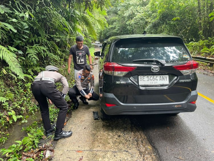 Satlantas Polres Lampung Barat menunjukkan kepeduliannya kepada masyarakat dengan membantu pengemudi yang mengalami masalah di jalan.