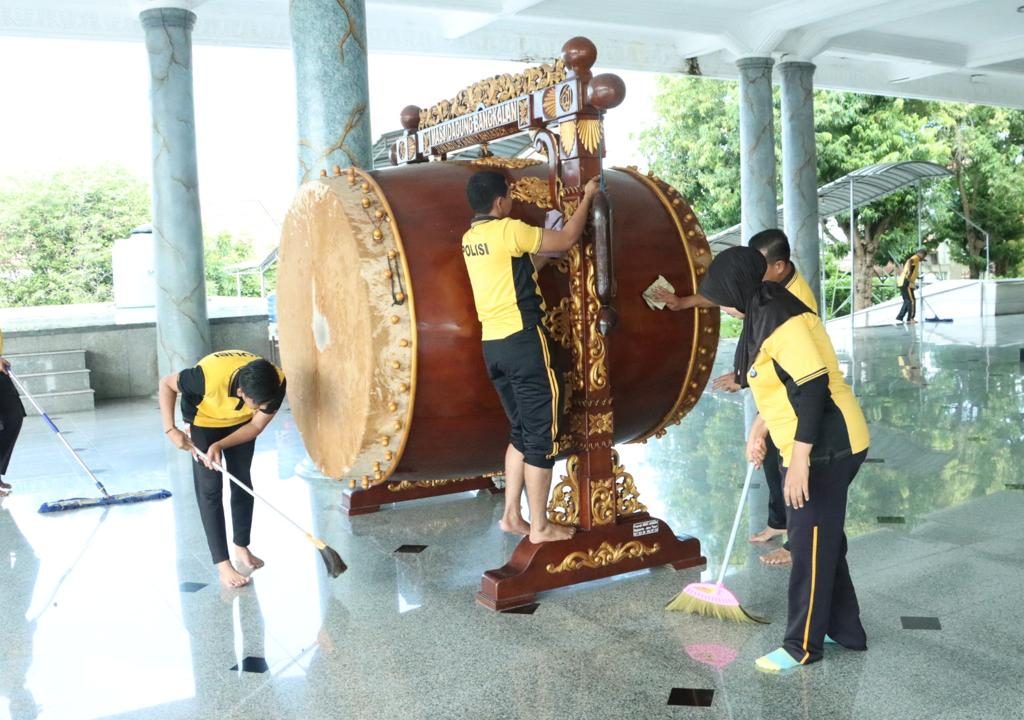 Dengan mengenakan seragam olahraga, tampak para personil sejak pukul 07.00 telah bersiap dengan berbagai alat kebersihan yang dibawanya, bahu-membahu membersihkan berbagai sudut bagian area masjid, mulai dari halaman, lantai, tempat wudhu, hingga memberihkan karpet dari debu-debu untuk memastikan kenyamanan jamaah.