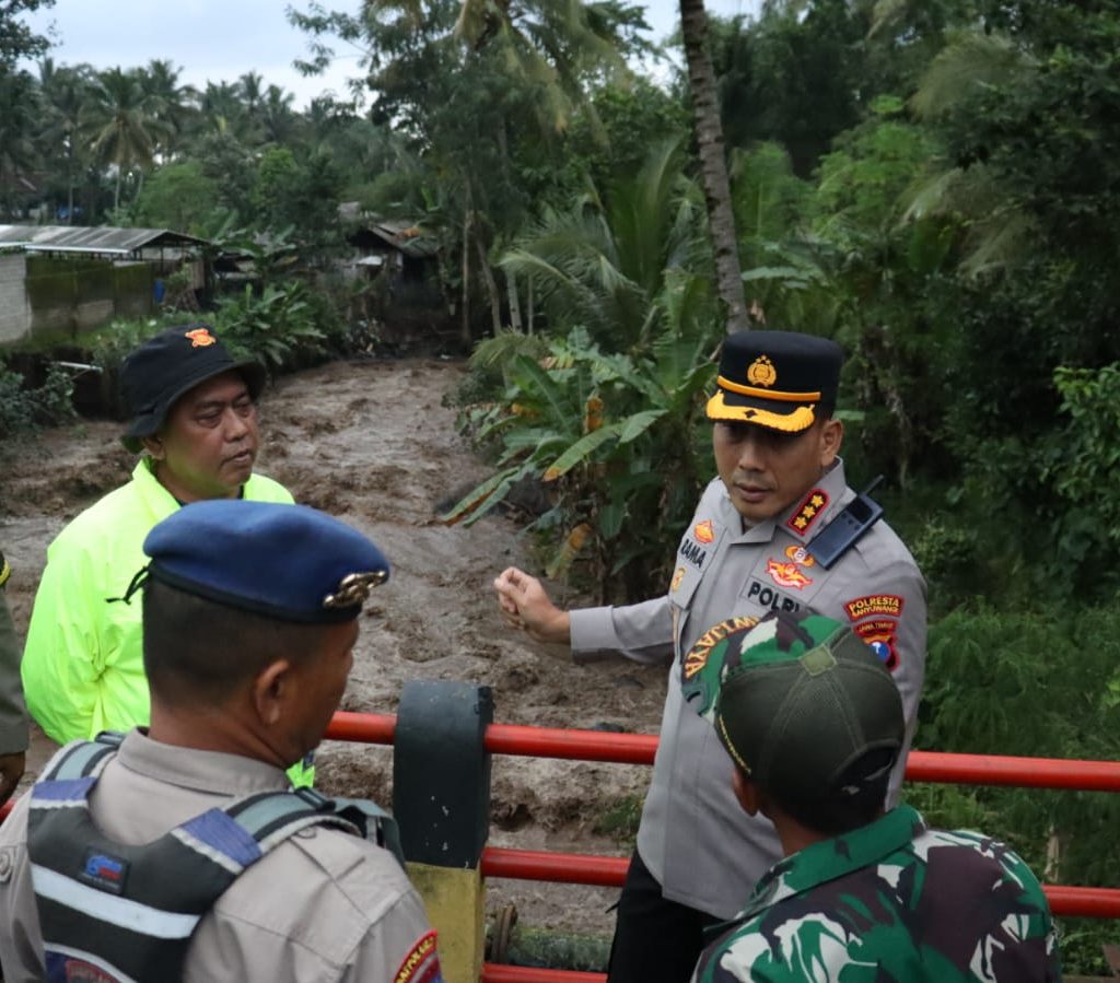 Kapolresta Banyuwangi Kombes Pol. Rama Samtama Putra, S.I.K., M.Si., M.H. meninjau langsung ke lokasi kejadian musibah orang hanyut di aliran Sungai Badeng, kawasan wisata Hutan Pinus, Dusun Sumberagung, Desa Sumberbulu, Kecamatan Songgon, Banyuwangi, Sabtu (28/6/2025).