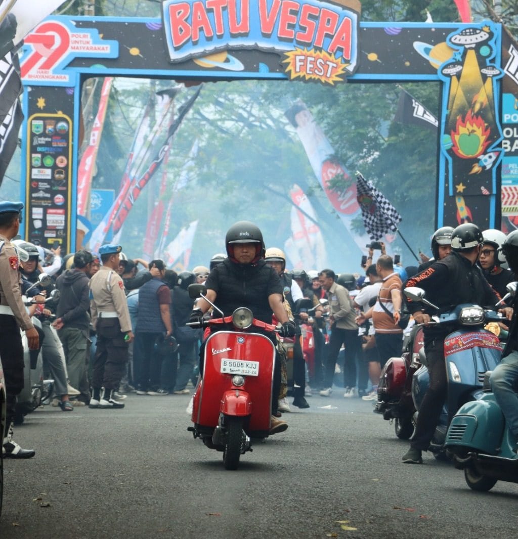 “Selamat datang di Kota Batu, Salam Satu Vespa Sejuta Saudara di Hari Bhayangkara ke -79,dengan ini Batu Vespa Fest 2025 dibuka,”