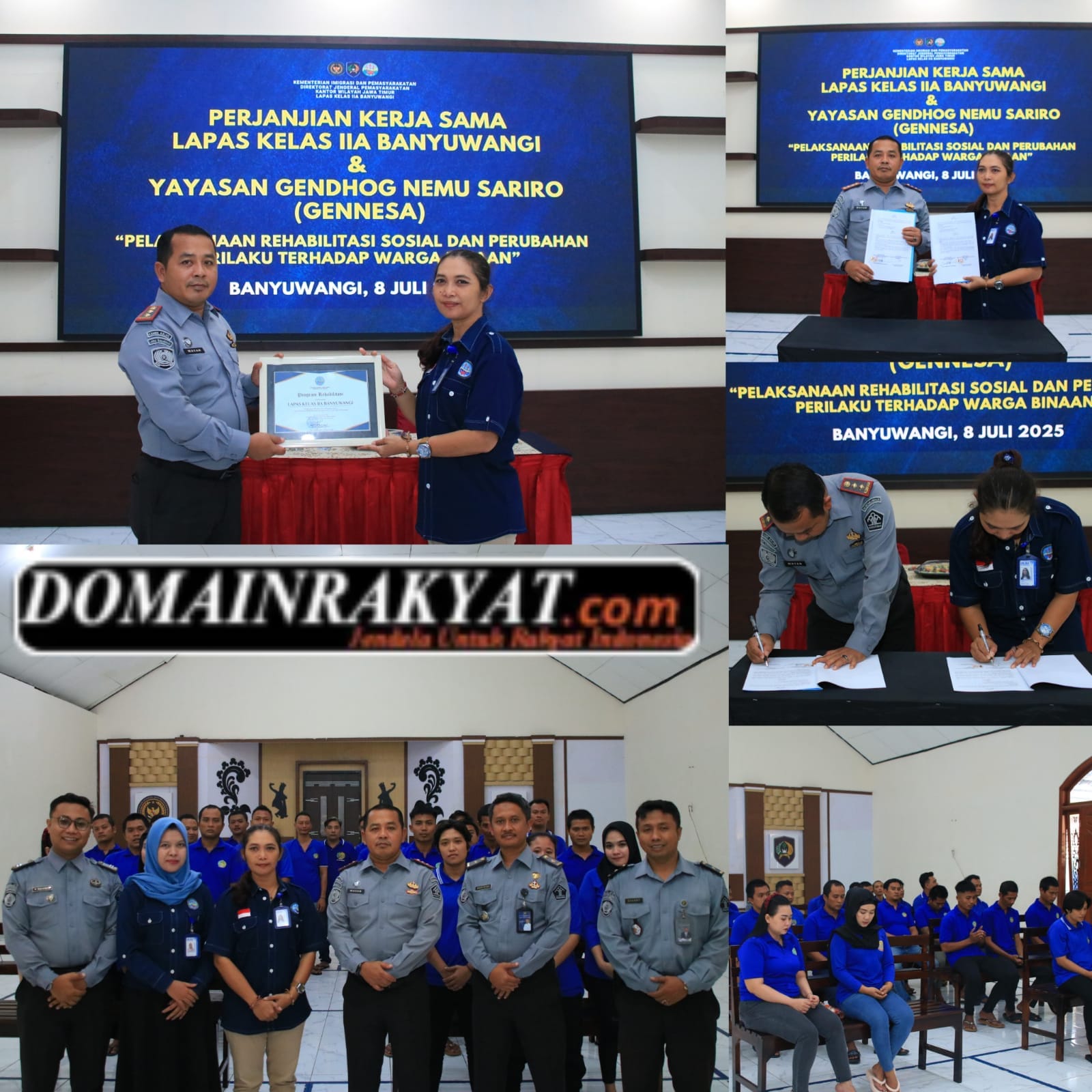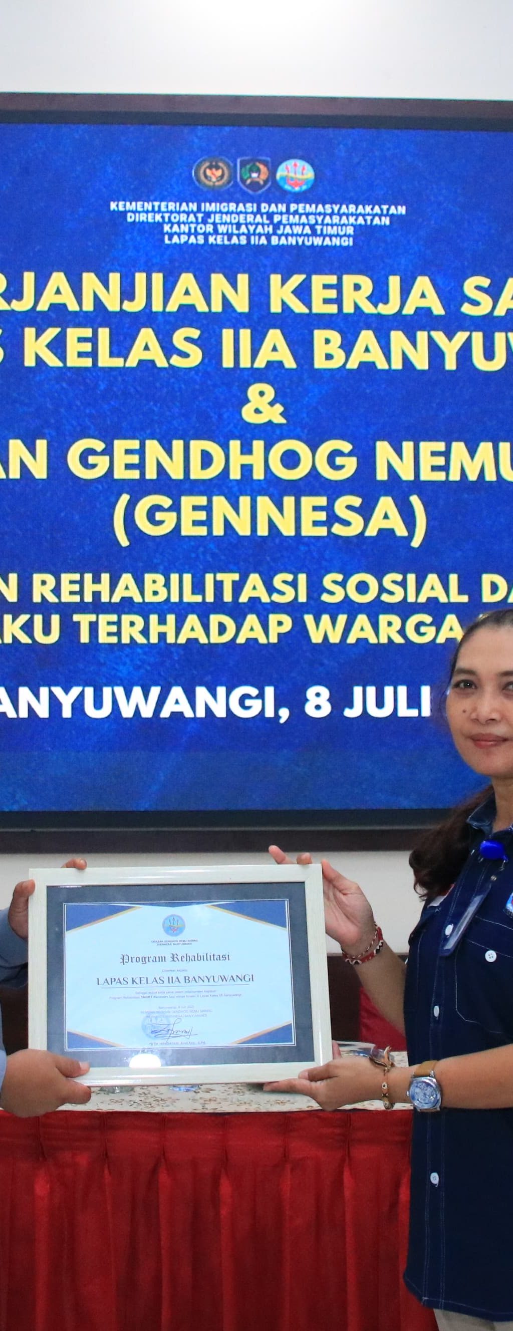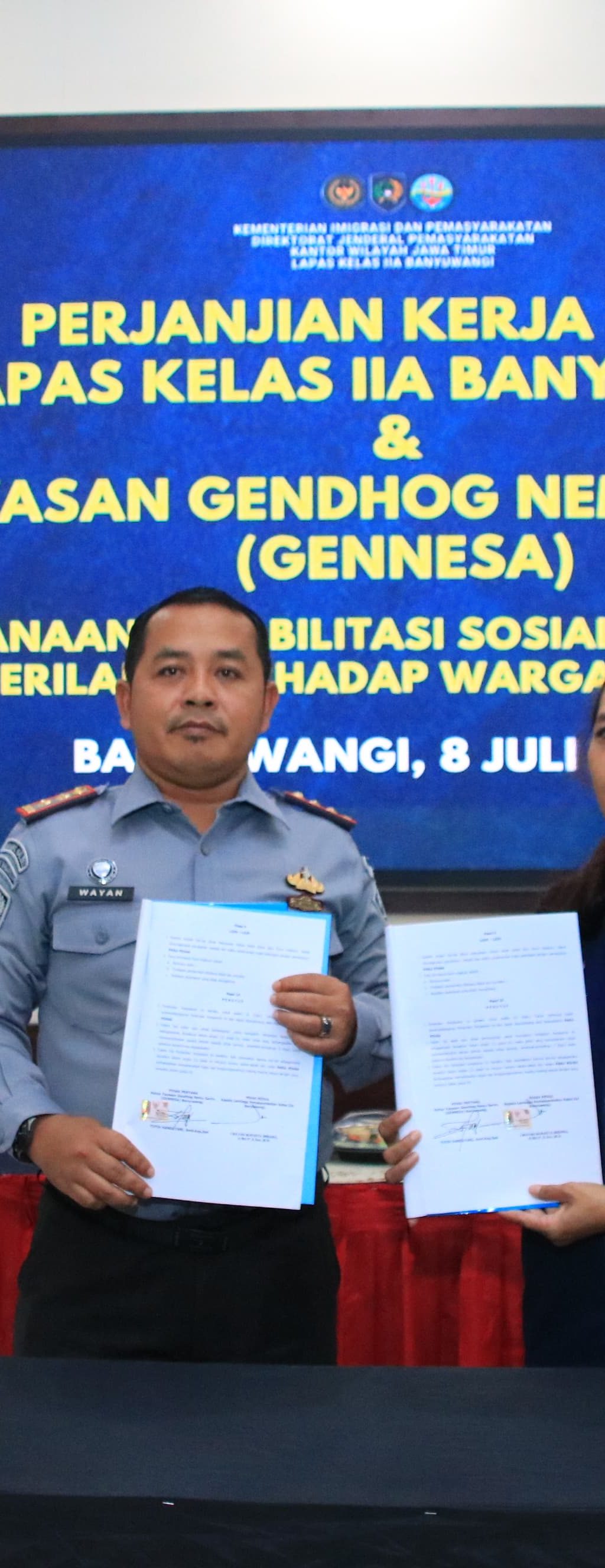 Lembaga Pemasyarakatan (Lapas) Kelas IIA Banyuwangi resmi menandatangani perjanjian kerja sama dengan Yayasan Gendhog Nemu Sariro (GENNESA) Banyuwangi dalam rangka pelaksanaan program rehabilitasi sosial bagi warga binaan, khususnya yang terjerat kasus penyalahgunaan narkotika Selasa (08/07) pagi.