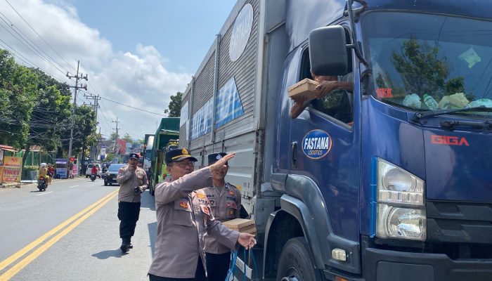Melalui Satbinmas Polresta Banyuwangi Polda Jatim turun langsung membagikan nasi kotak kepada para sopir truk di sepanjang jalur Pelabuhan Ketapang, Kecamatan Kalipuro, Banyuwangi.